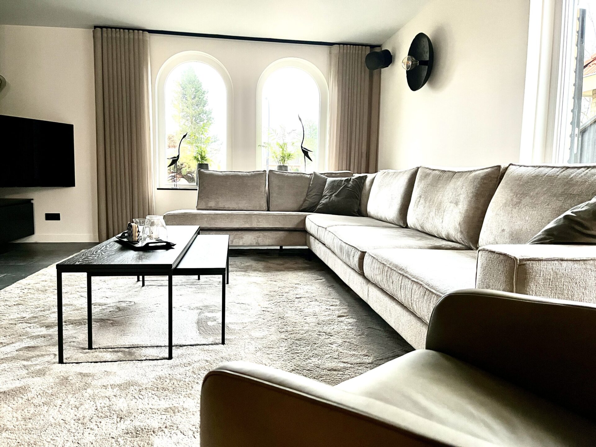 De ruime zitbank is een groot en rustig element, de ranke salontafels geven extra kracht aan het vloerkleed